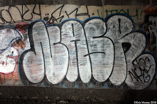 For years I had been shooting pics with my old pocket digital and not my present DSLR. With a little camera like that it's a pretty straight forward "point and shoot" mentality. Only since I got my Canon T1i have I started to expand my sense of capturing an area and not just the graffiti or street art. I still kick myself for no having taken pan shots of Turcot or at the very least shots that take in the area rather than just the paint on the walls. Last September though, I decided that I would start to get those kind of shots.Sadly though, the main yards have all been shut down with all the construction and security crews lurking about. A couple of times in October and November I was chased down by security after they had either spotted me or seen the flash going off at some point. I made clever getaways each time, but getting anything solid of the interior main yard area under the Decarie Expressway isn't going to happen. At least not yet. Even then, there isn't anything up in that area, it's all buffed, and I don't think that there is anything worth paying attention to, or at least I haven't seen anything up until now. Somebody tried to start some letters off of one of the pylons using the scaffolding but its incomplete. Most likely whoever it was got made and had to split.